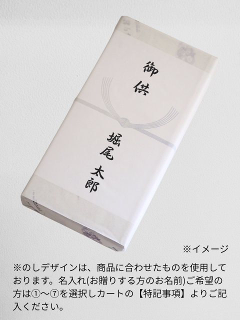 ①〜⑦の中からご希望の熨斗タイプをお選びいただき、カートにお進みください。