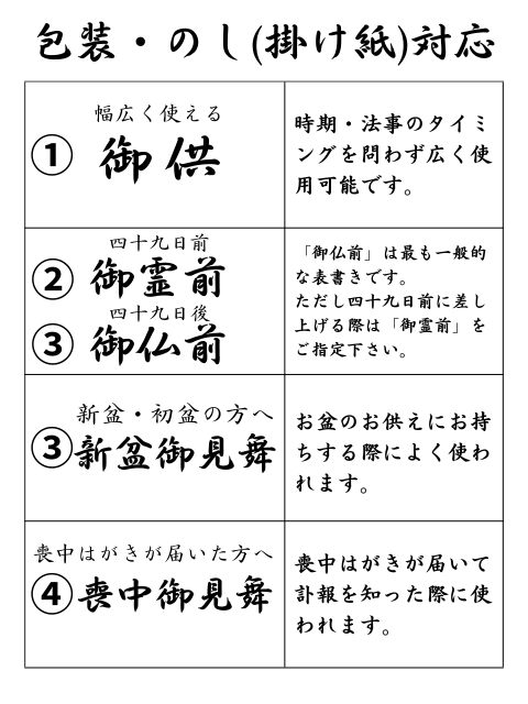 商品に合わせた熨斗をお付けいたします。