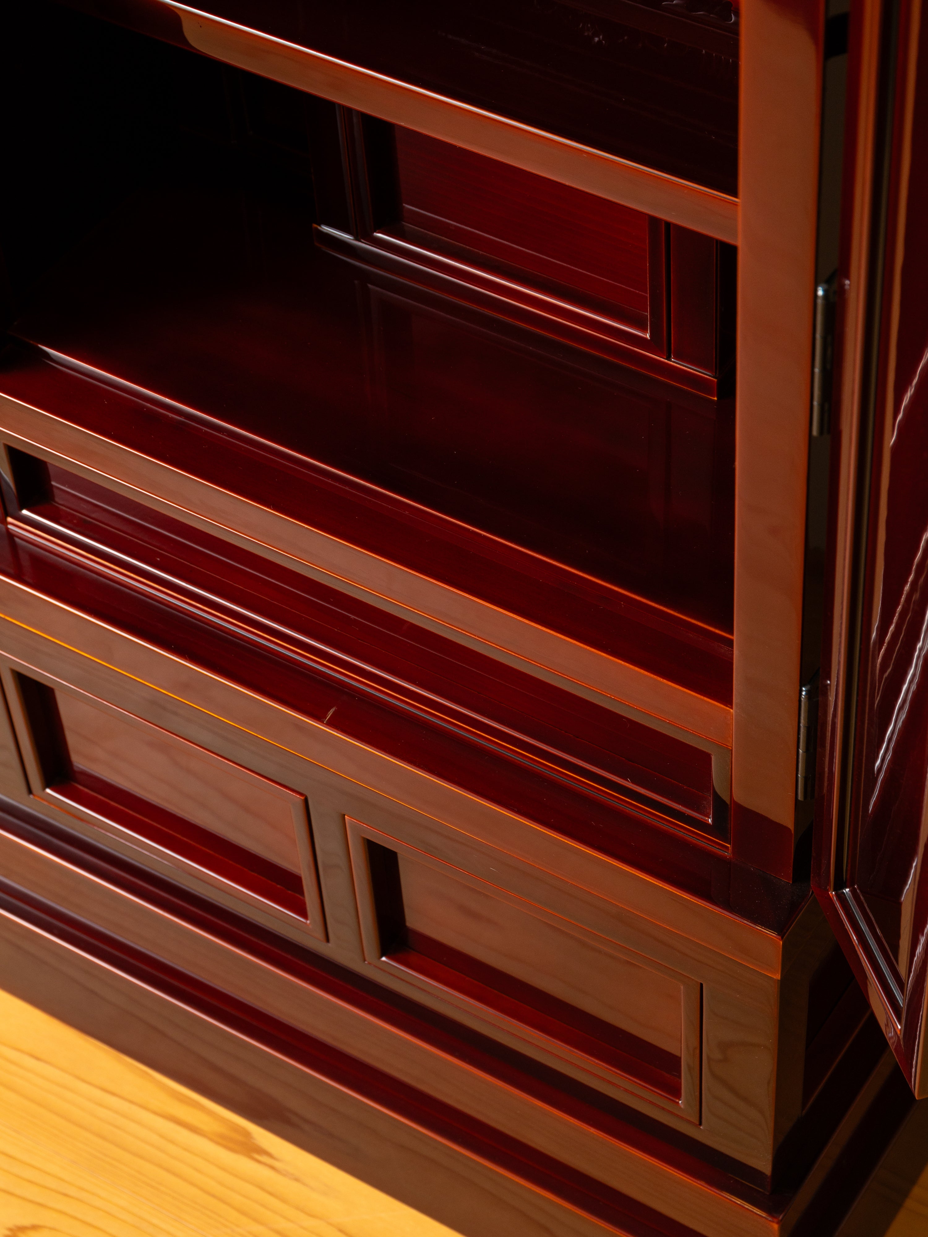春慶塗特有の濃淡はあたかも金箔で装飾したかのように輝き、金仏壇や唐木仏壇とは違う表情を見せます。