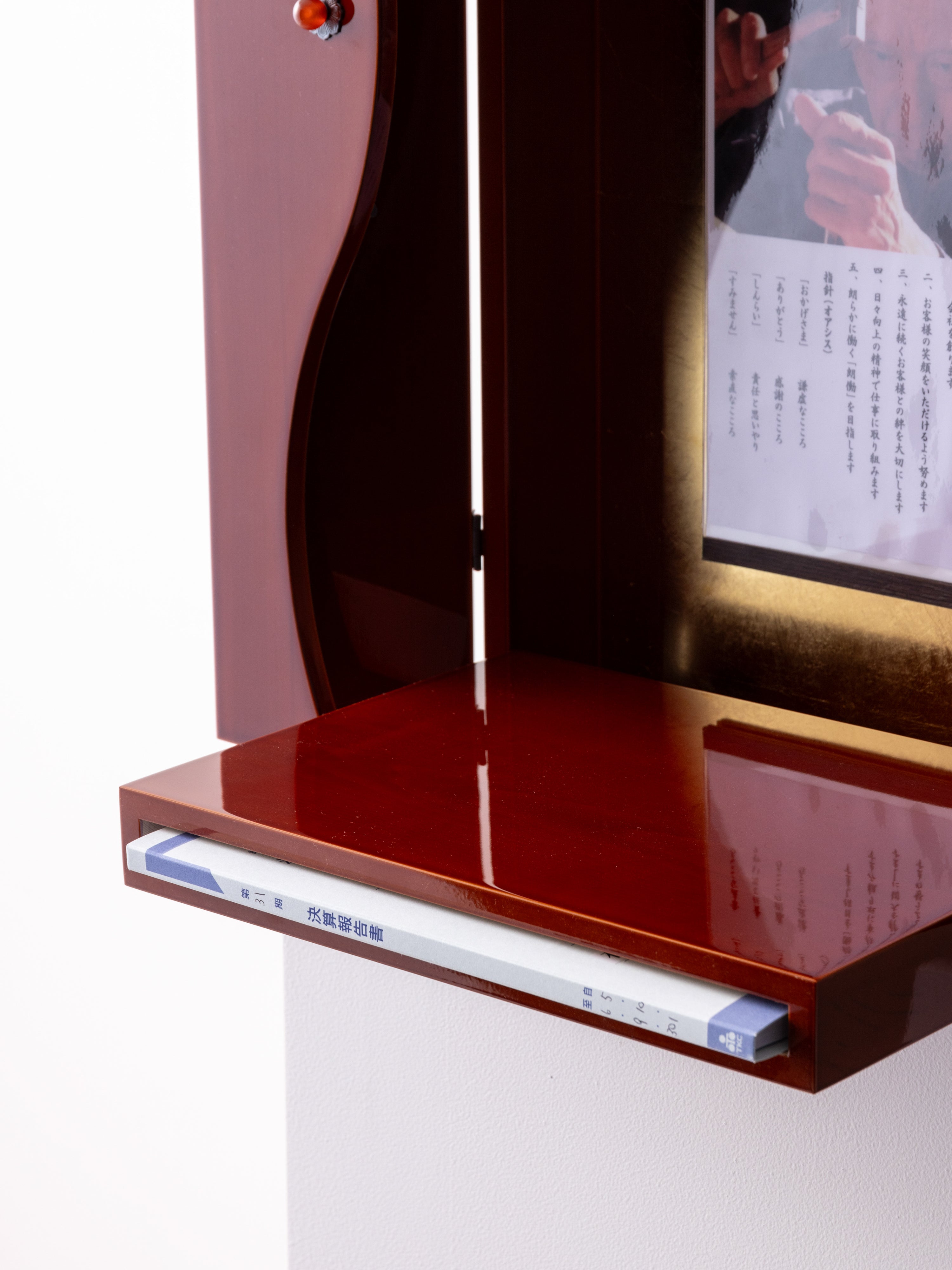 決算書や計画書といった重要書類を収め、先代の写真や記念の品とともに飾り会社の繁栄を願う、新しい空間のご提案です。