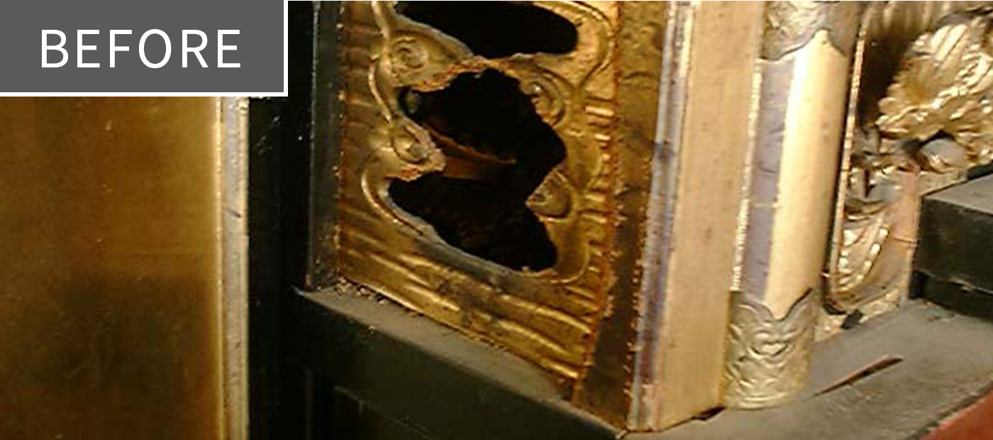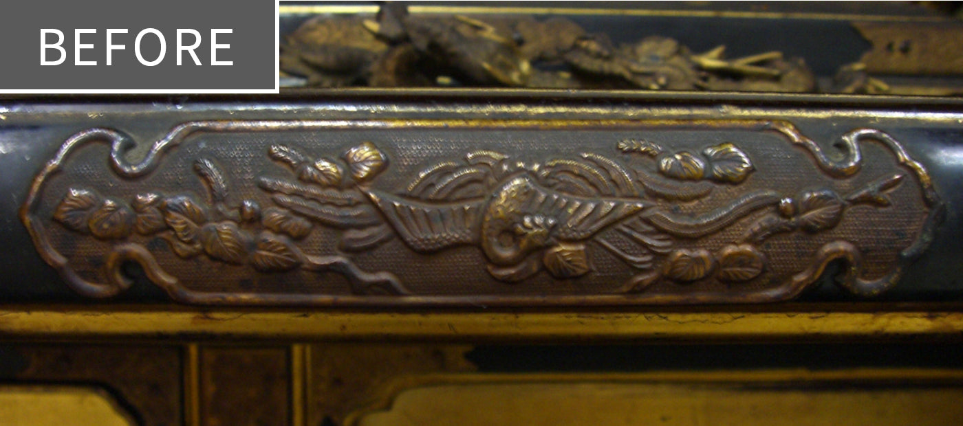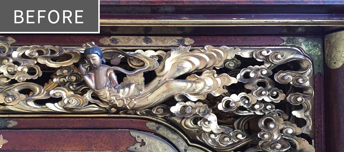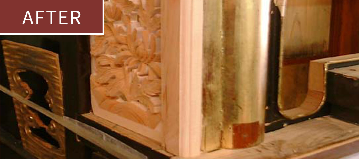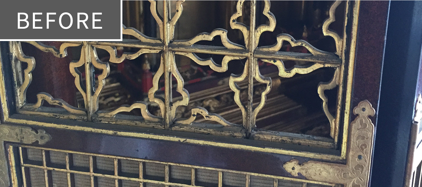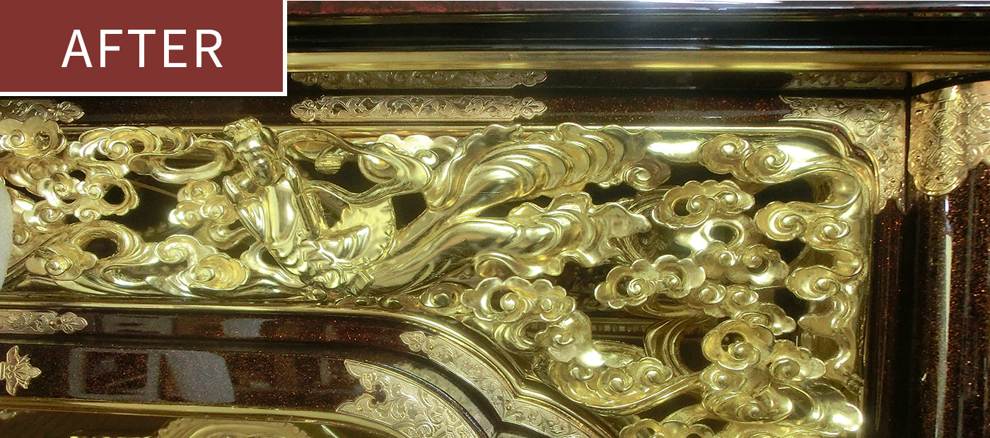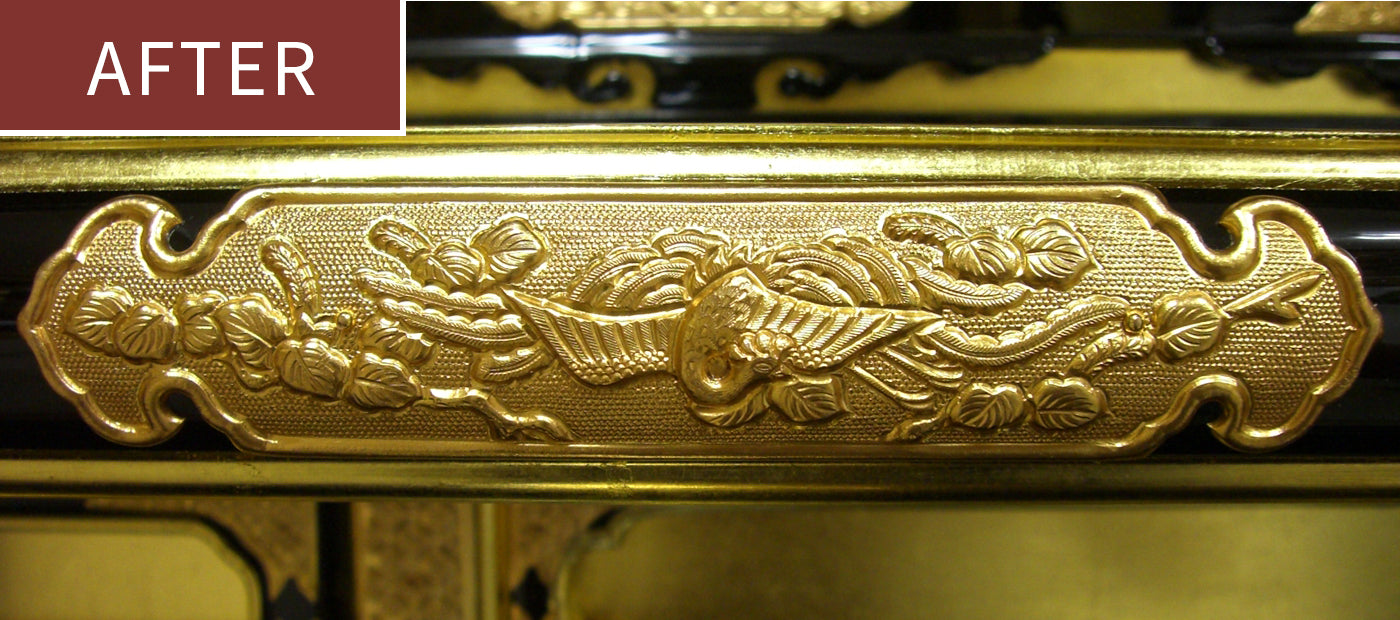 塗替えや金箔の張替え、そして金具の修理や金メッキ等を施して、新品と同様に仕上げる完全修復修理が可能です。