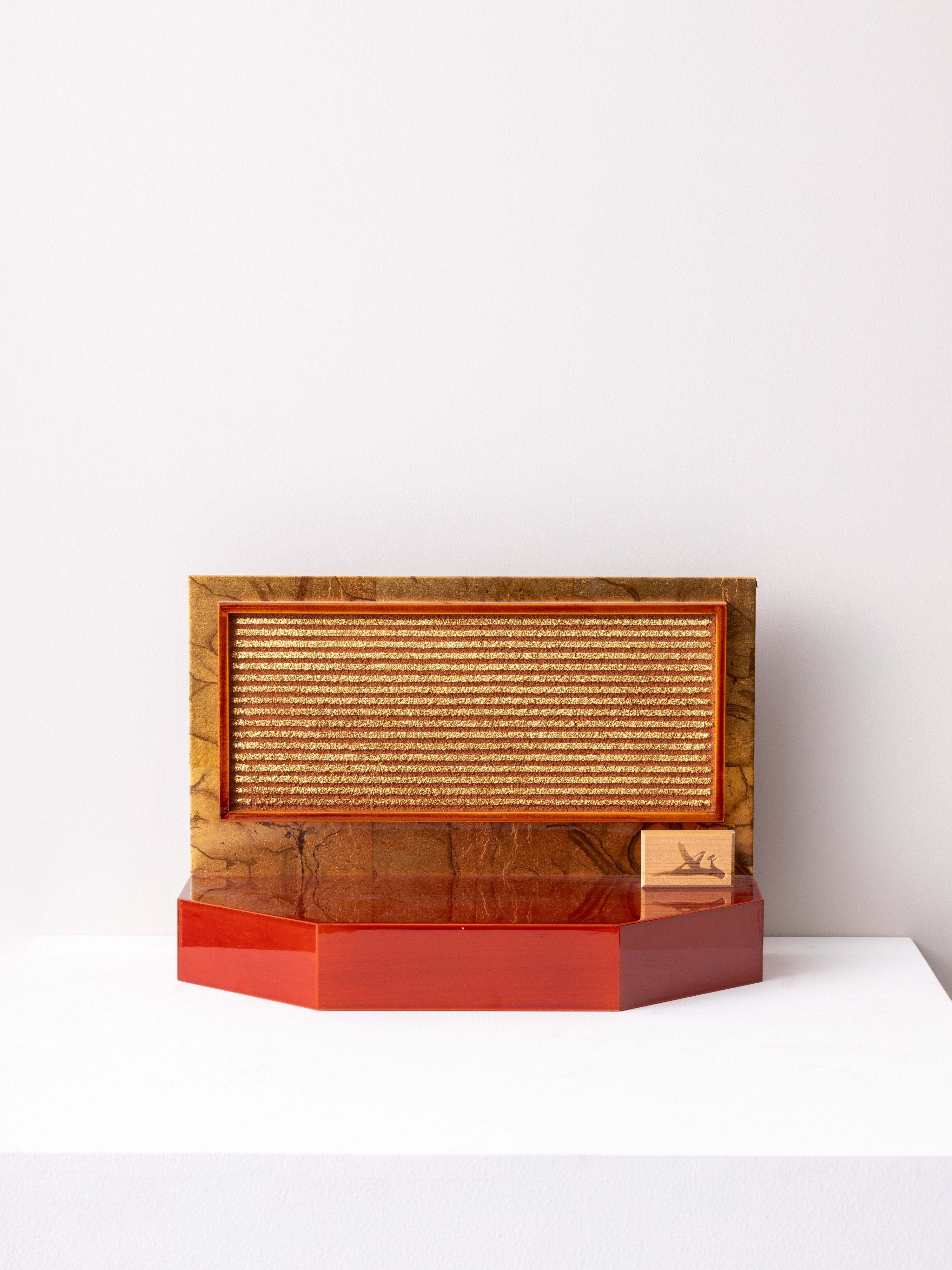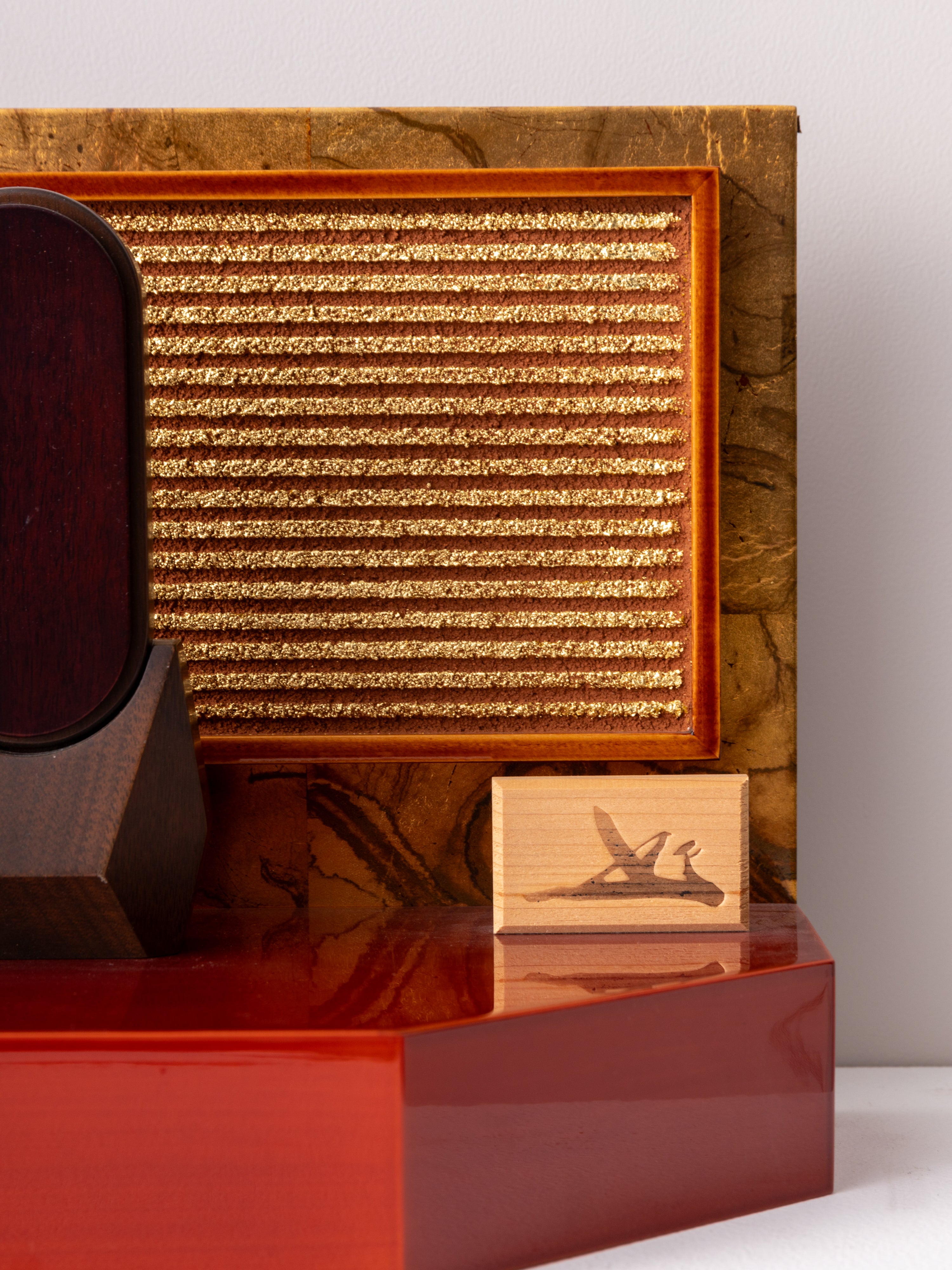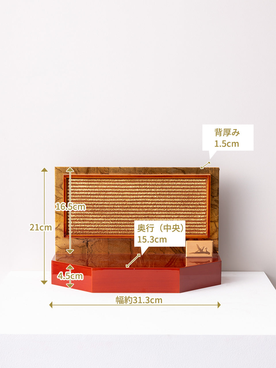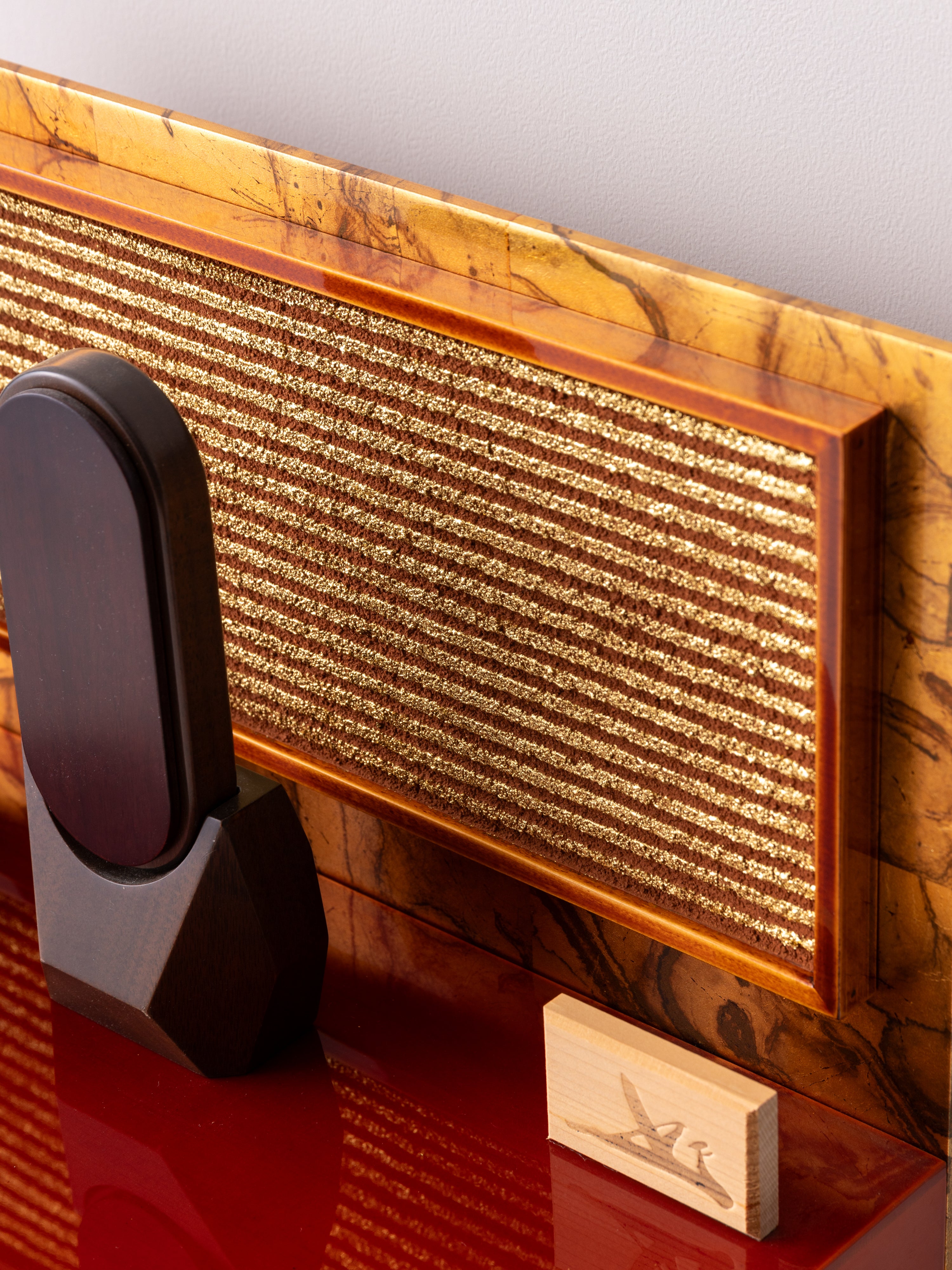 春慶塗の深い輝きと、金箔貼りの土壁が織りなすコラボレーションが、重厚感と華やかさを引き立てます。